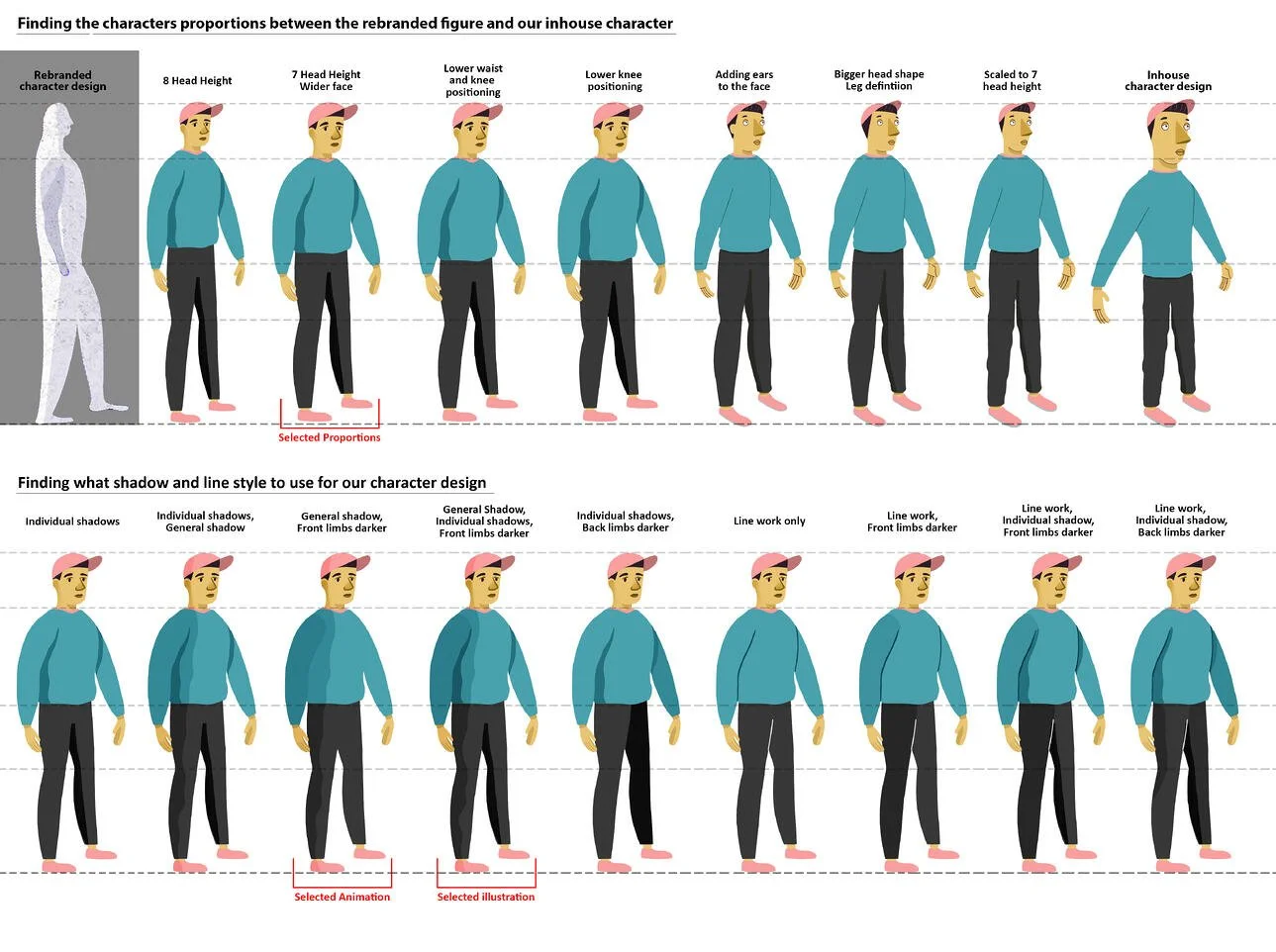 From this exploration we felt that the previous character design proportions would not fit this new illustration style. We decided to move forward with altering our characters to fit in with the new illustration style. What we started with was using these initial illustrated characters as a proportional guide and resize the previously designed characters to match those proportions.