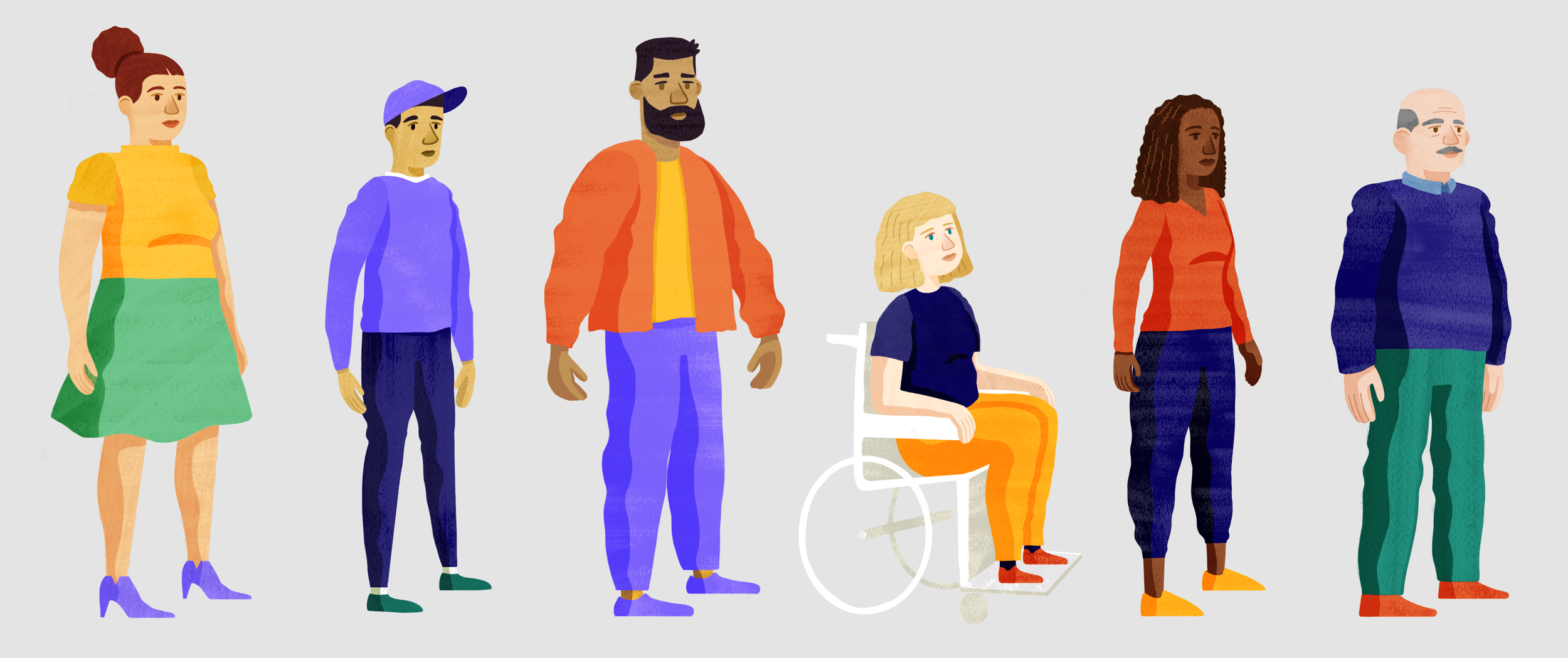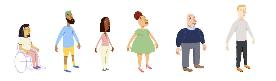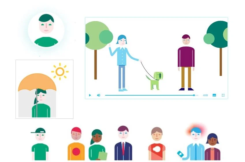 To the left is a selection of the people that were created for the illustrations. We felt that these characters wouldn’t work for our animated videos. They lacked the ability to emote and didn’t resemble the end users appearance. We wanted something that people could relate to, like the character designs we had developed just before the company rebranding. We attempted to see if the characters we designed would fit into the new illustrated design. We tried to put them in as is, we tried different colour variants of the characters and changing the character to the new illustrated character proportions.